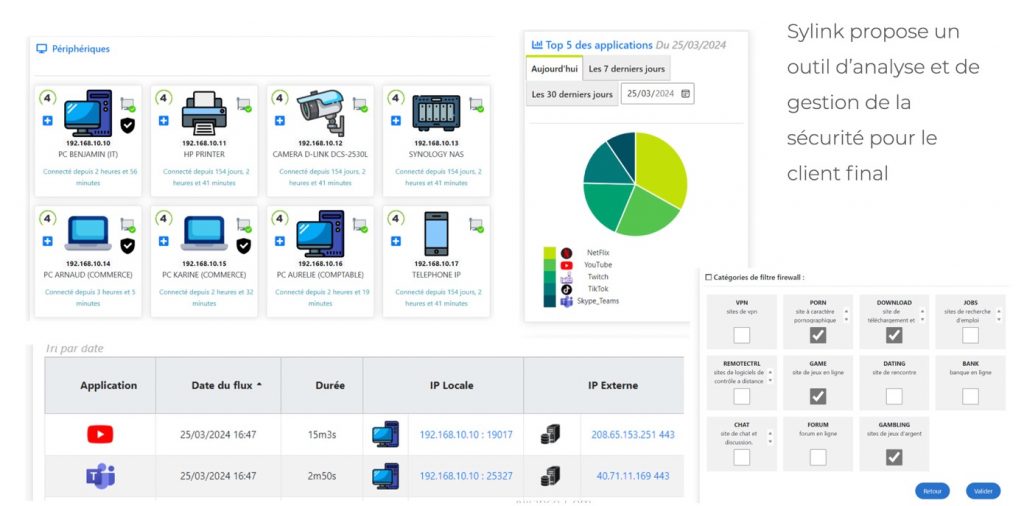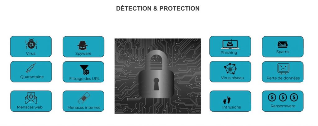 La SYLink Box protège contre : phishing, ransomwares, spywares, cryptolockers, attaques DDoS, exfiltration de données, ports scannés, espionnage, menaces internes, failles zero-day.